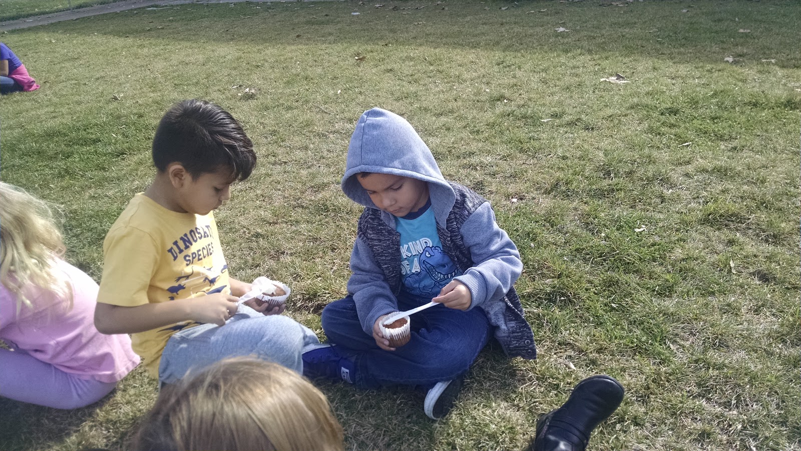 On Wednesday of this week, we went back to the carrots. This time we tasted carrots inside of carrot cake muffins. We shared these with the fourth graders who helped us harvest and wash all of the carrots. Each kindergarten student was partnered up with a fourth grade student who helped them put their own frosting onto their cupcake. Then of course.... we ate our cupcakes in the beautiful sunshine!